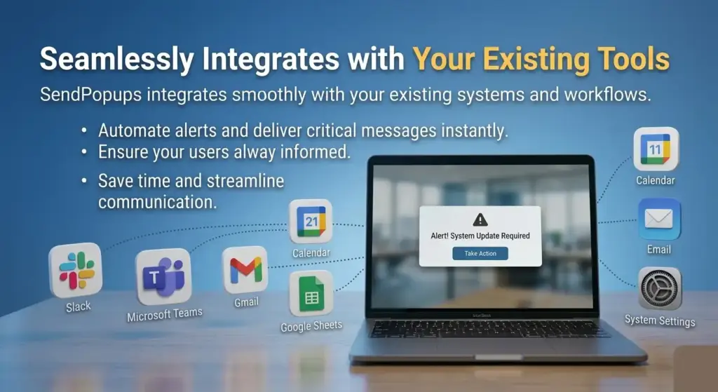 SendPopups integrates smoothly with your existing systems and workflows, allowing you to automate alerts and deliver critical messages instantly. Save time, streamline communication, and ensure your users always stay informed.