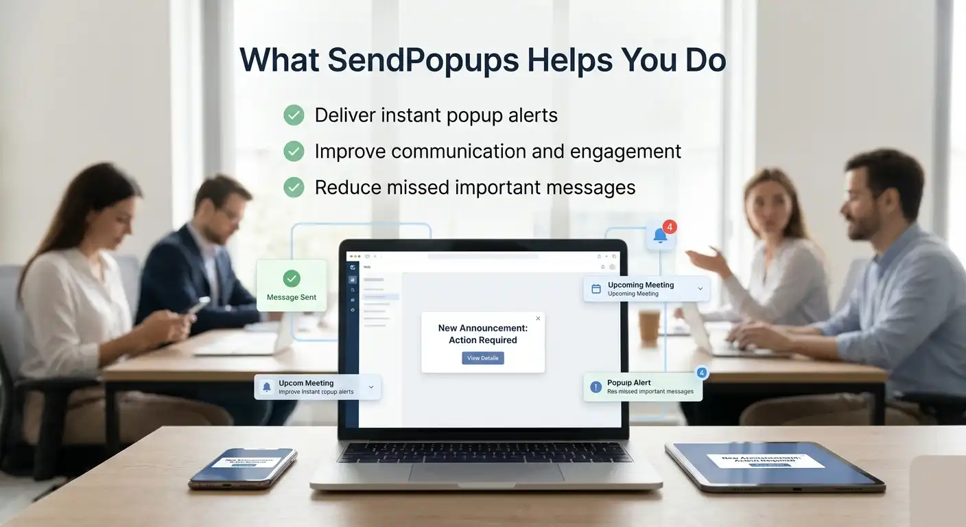 SendPopups helps organizations deliver important messages instantly through high-visibility popup communication. We built SendPopups for teams that need fast, clear, and impossible-to-miss messaging for announcements, urgent updates, internal notices, and time-sensitive campaigns. Our goal is simple: help businesses communicate better when timing matters most.