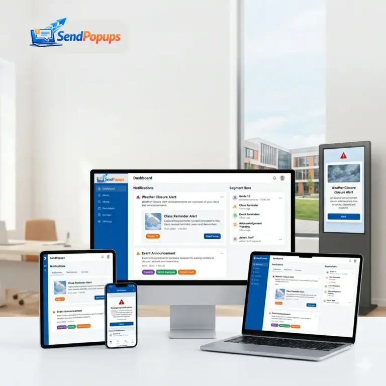 SendPopups is designed to help non-technical teams send visible, targeted messages quickly. Communications can be scheduled, segmented, tracked, and delivered through multiple channels depending on the urgency and audience.