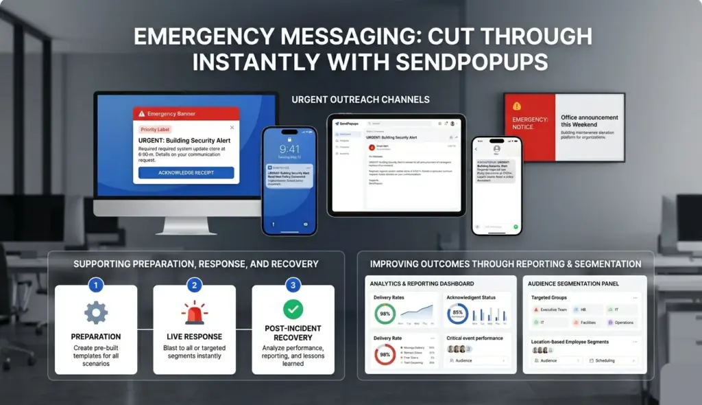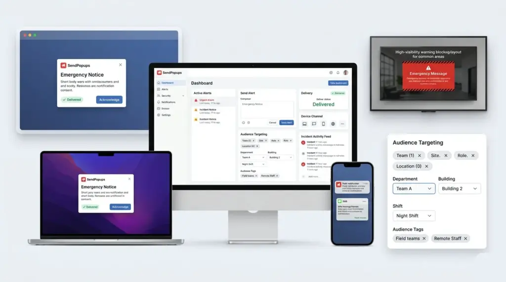 Use SendPopups as a fast, high-visibility emergency communication platform for urgent alerts, crisis response, safety instructions, and post-incident updates across desktop, mobile, SMS, and shared screens.