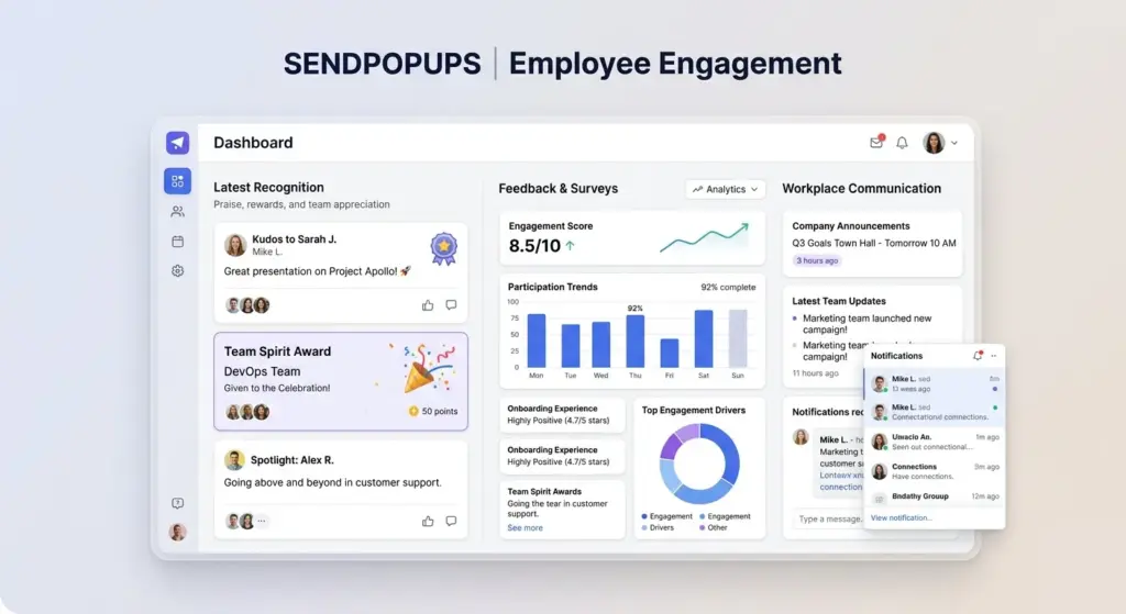 SendPopups is the faster way to recognize employees, run pulse surveys, share internal campaigns, and measure engagement across desktop, mobile, digital signage, and other high-visibility channels.