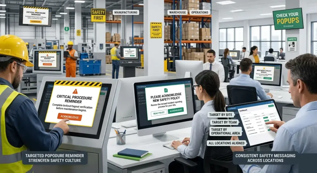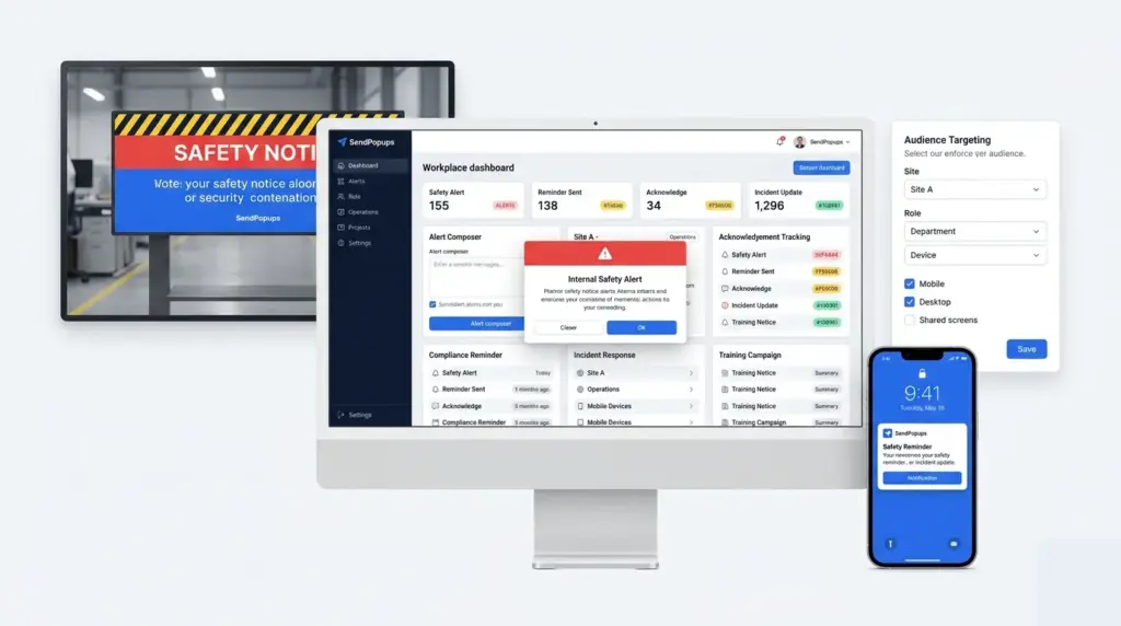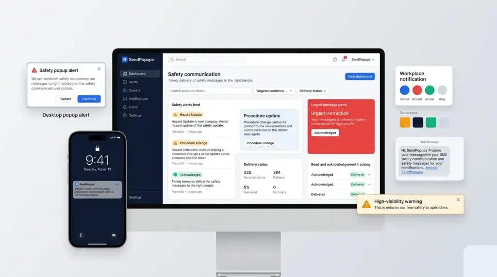 SendPopups helps organizations deliver urgent safety notices, compliance reminders, hazard updates, training prompts, and emergency instructions across desktops, mobile devices, digital signage, and shared screens.